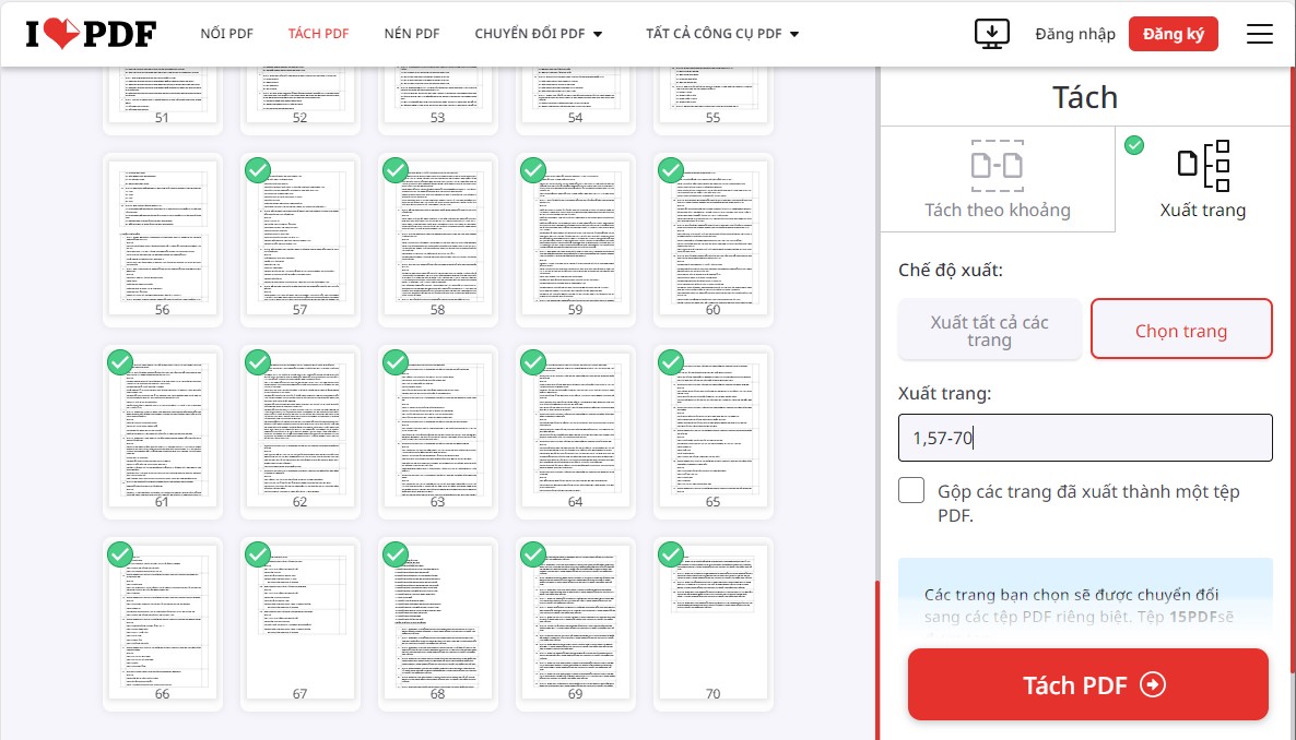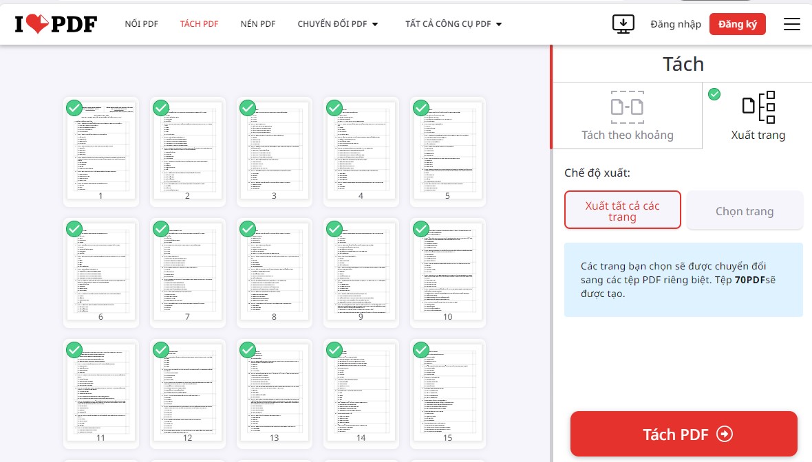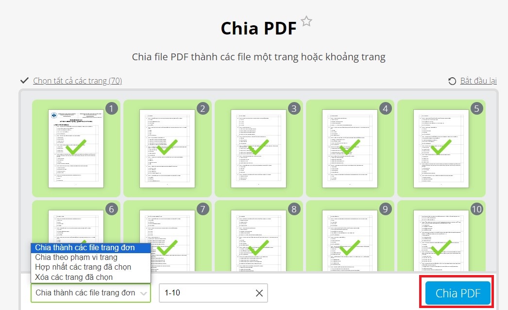 Bước 3: Tất cả các trang trong file PDF vừa tải lên sẽ được tick chọn theo mặc định. Bạn có 4 lựa chọn để cắt file PDF: