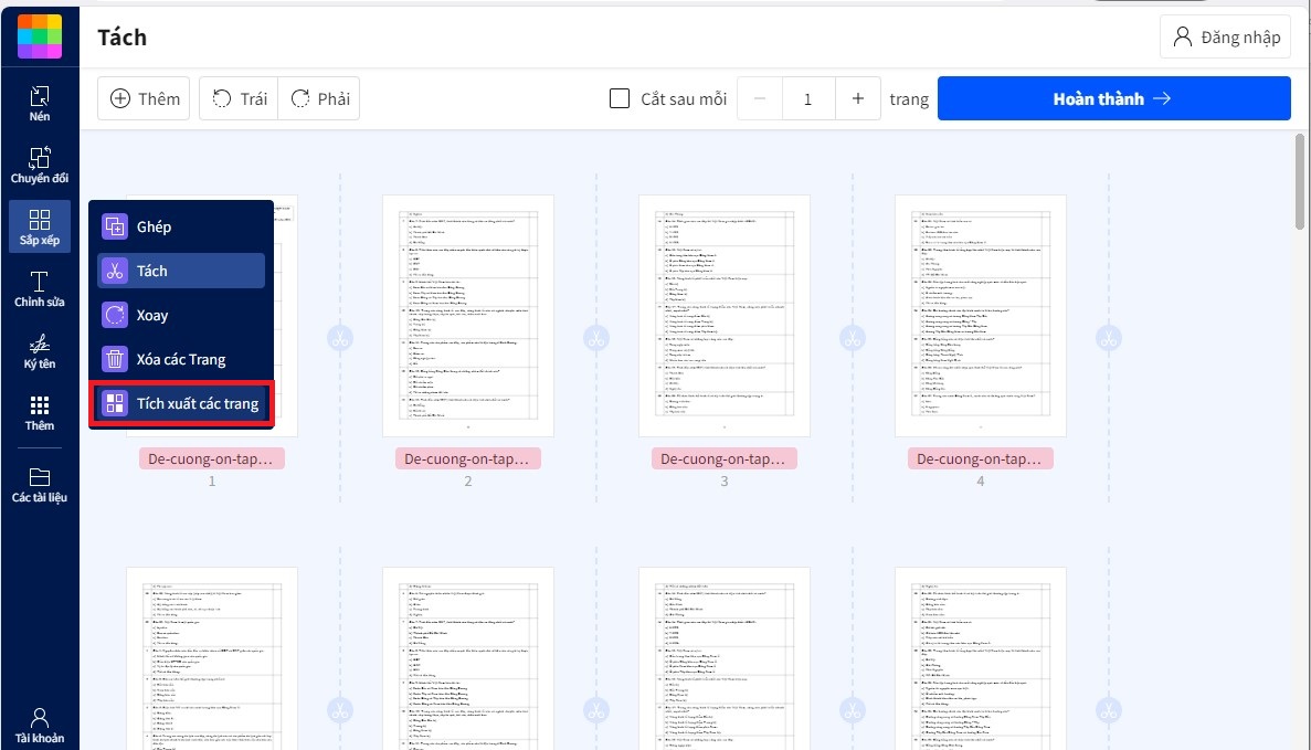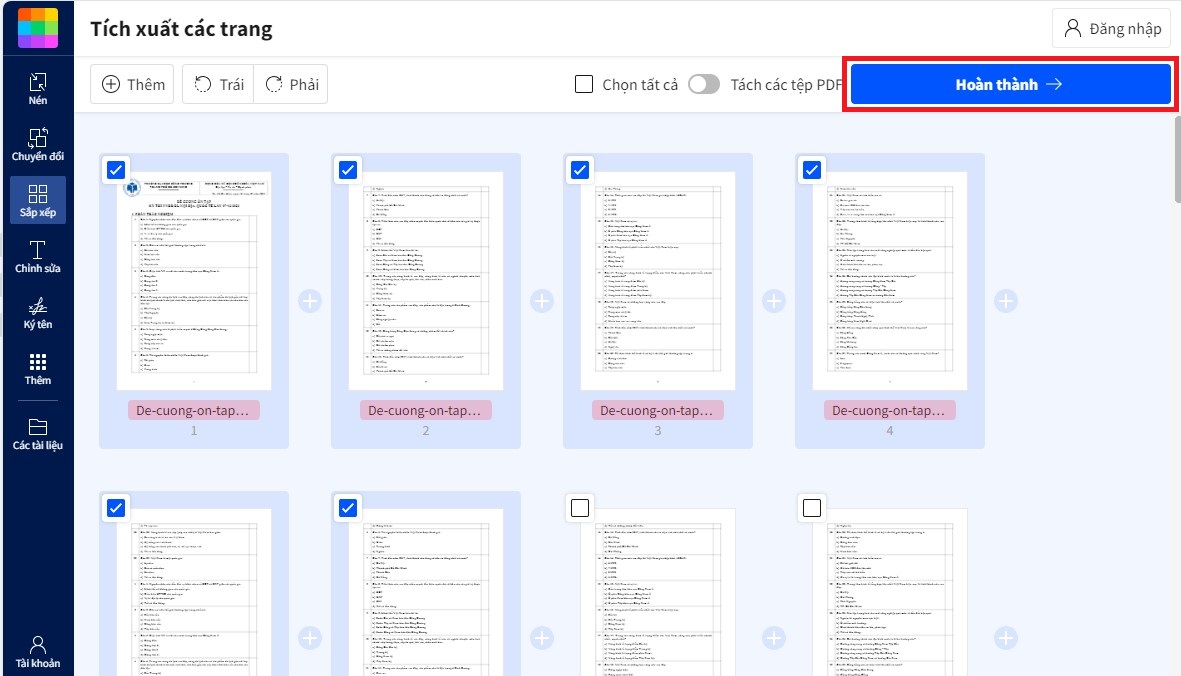 Bước 4: Bạn tick chọn những trang muốn cắt, tiếp theo nhấn vào Hoàn thành và chờ trong giây lát để xuất file.