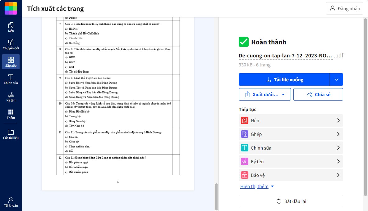 Bước 5: Sau khi xuất file xong, bạn chọn Tải file xuống để tải file PDF vừa cắt về máy.
