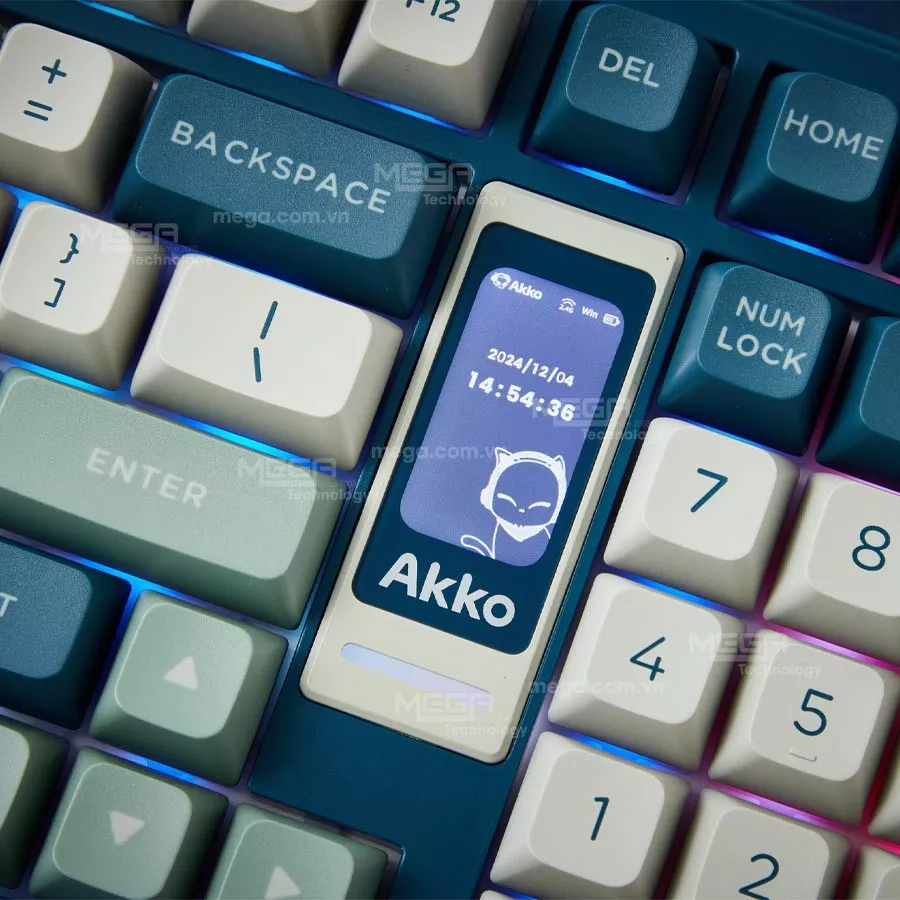 AKKO 5098B Ink Green Ice Cream Pink có phong cách thiết kế hiện đại với tông màu xanh trắng chủ đạo. Điểm nhấn nằm ở màn hình LCD tích hợp trên bàn phím, cho phép hiển thị các thông tin quan trọng như trạng thái kết nối, dung lượng pin hoặc hình ảnh tùy chỉnh. Bên cạnh đó, bàn phím còn được trang bị con lăn multimedia còn giúp người dùng điều chỉnh âm lượng hoặc thao tác nhanh trong quá trình sử dụng.