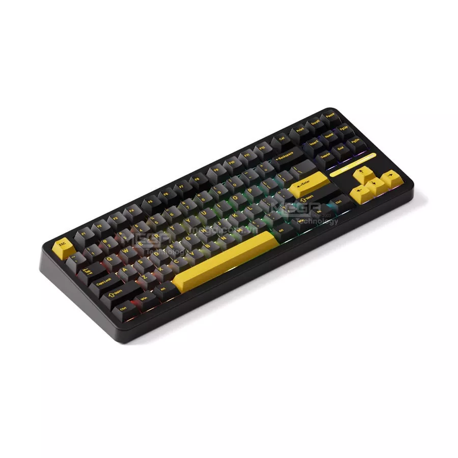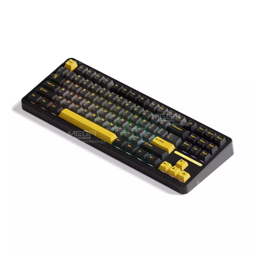 AKKO TAC87 sử dụng layout TKL 87 phím, loại bỏ cụm numpad tối ưu diện tích bàn làm việc để tạo không gian thoải mái hơn cho các thao tác chuột. Thiết kế này đặc biệt phù hợp với người dùng văn phòng, game thủ hoặc góc setup cần sự tối giản. Chiếc bàn phím này của Akko mang phong cách hiện đại, phối màu đen chủ đạo kết hợp điểm nhấn màu vàng nổi bật. Keycap PBT double-shot cho bề mặt gõ chắc tay, hạn chế bóng dầu và đảm bảo độ bền trong quá trình sử dụng lâu dài.