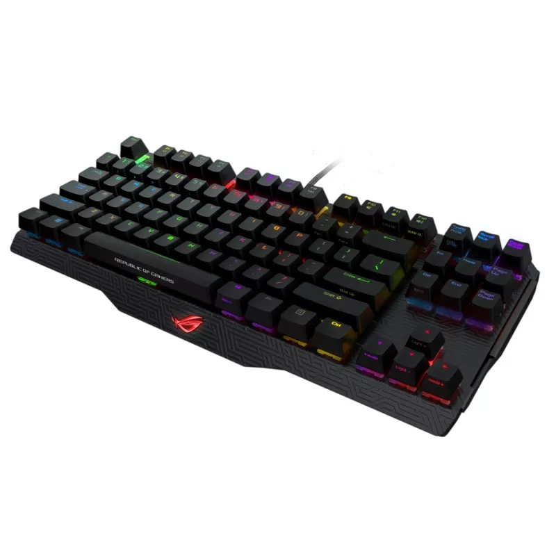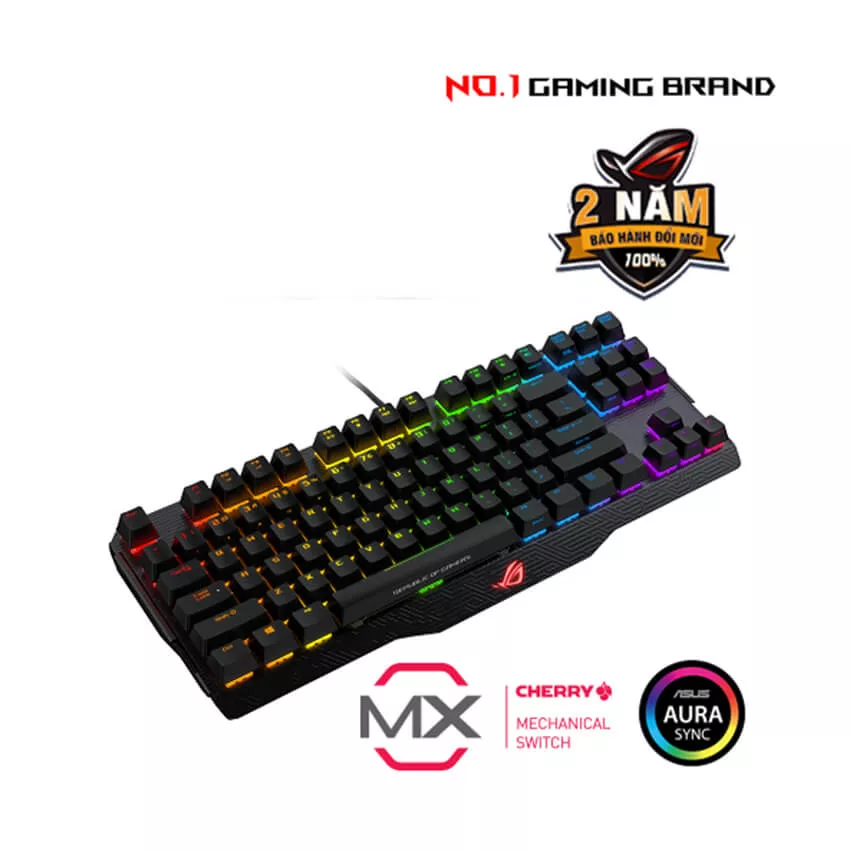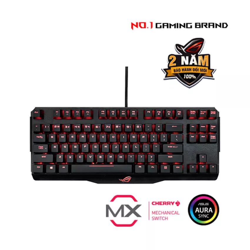Bàn phím có ngoại hình mang đậm phong cách ROG với các đường nét sắc sảo, logo đặc trưng và hệ thống đèn RGB Aura Sync với nhiều hiệu ứng ánh sáng sống động, giúp góc gaming trở nên nổi bật hơn.
