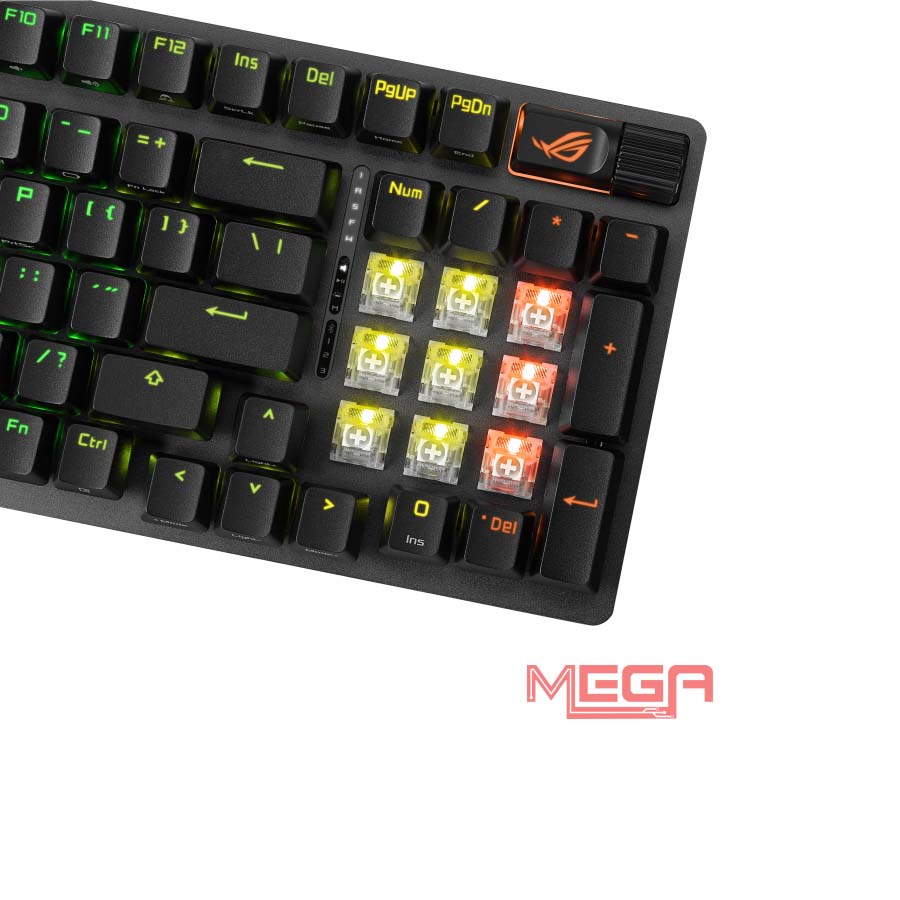 Ở góc trên bên phải bàn phím có phím đa chức năng hoạt động kết hợp với con lăn có thể bấm được. Nhấn phím đa chức năng sẽ chuyển đổi giữa bốn chế độ: âm lượng, phương tiện, ánh sáng và tùy chọn có thể tùy chỉnh có thể được cấu hình trong Armory Crate của Asus.