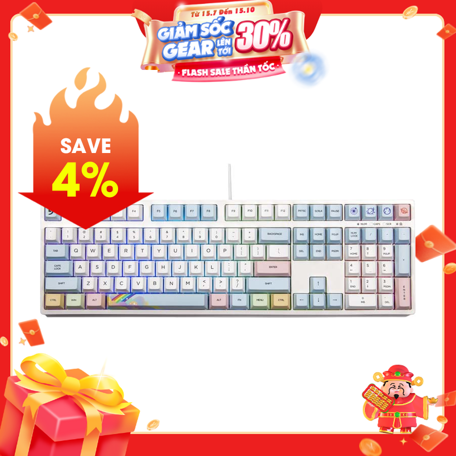 Bàn phím cơ Fuhlen CK108S Sunshine Silver Switch được trang bị hệ thống LED RGB cực sáng, giúp chiếc bàn phím luôn nổi bật khi đặt trong mọi góc máy cũng như giúp trải nghiệm gõ phím trong môi trường thiếu sáng. Không chỉ sở hữu nhiều chế độ chiếu sáng, hệ thống LED RGB này còn có chế độ nhấp nháy theo nhạc.