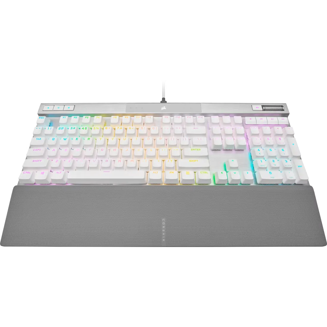 Bàn phím được trang bị RGB LED trên từng phím, mang lại hiệu ứng ánh sáng sống động và rõ ràng. Trên nền trắng – bạc, ánh sáng RGB càng trở nên nổi bật, giúp người dùng dễ dàng cá nhân hóa setup hoặc đồng bộ với các thiết bị Corsair khác để tạo tổng thể hài hòa và chuyên nghiệp.