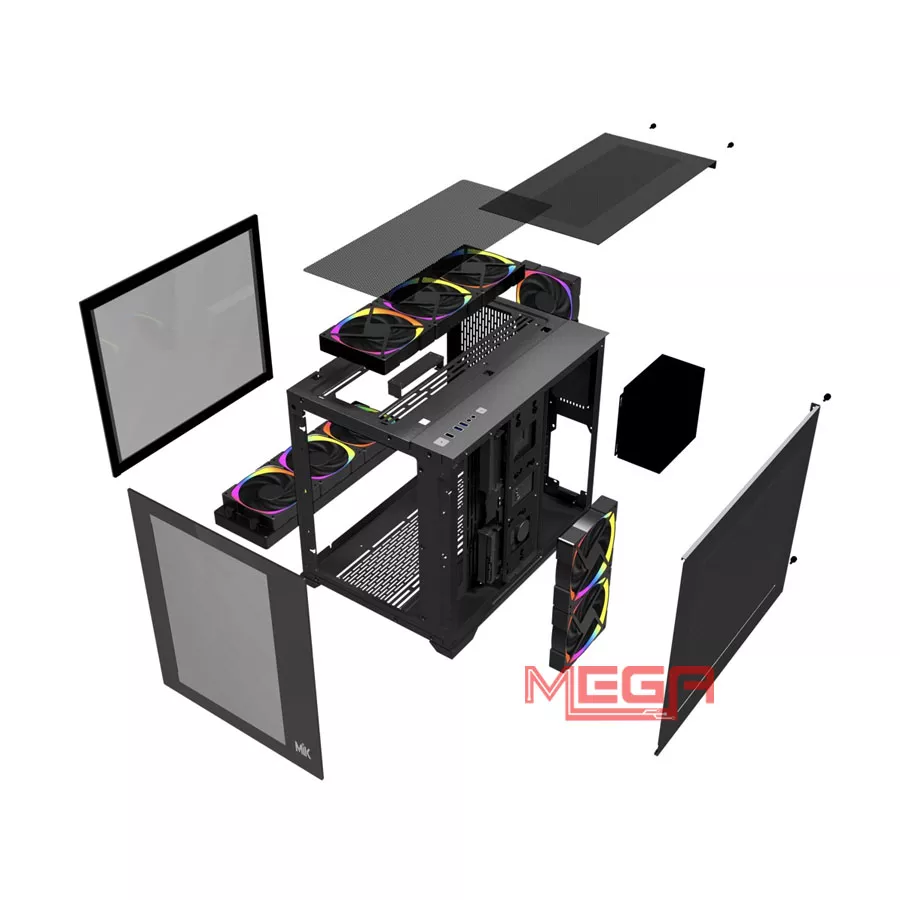 | Giá đỡ quạt | Hỗ trợ tối đa lên đến 10 quạt 120mm: Mặt trên: 3 x 120mm / 2 x 140mm Mặt dưới: 3 x 120mm Mặt hông (MB Panel): 3 x 120mm Mặt sau: 1 x 120mm |