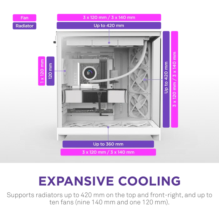 | Giá đỡ bộ tản nhiệt | Bên hông: Tối đa 360mm Trên: Tối đa 360mm / 280mm Dưới: Tối đa 360mm / 280mm Sau: Tối đa 120mm |