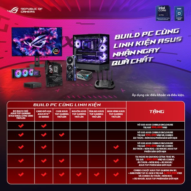 - Build PC cùng Bo mạch chủ ASUS TUF Gaming B760/ B860/ Z790/ Z890 series trở lên* + Cạc đồ họa ASUS Geforce RTX™50 series + Case máy tính ASUS TUF Gaming series trở lên tặng Combo áo thun + nón ROG phiên bản giới hạn và Vỏ SSD ASUS Cobble Enclosure trị giá 990,000VND.
