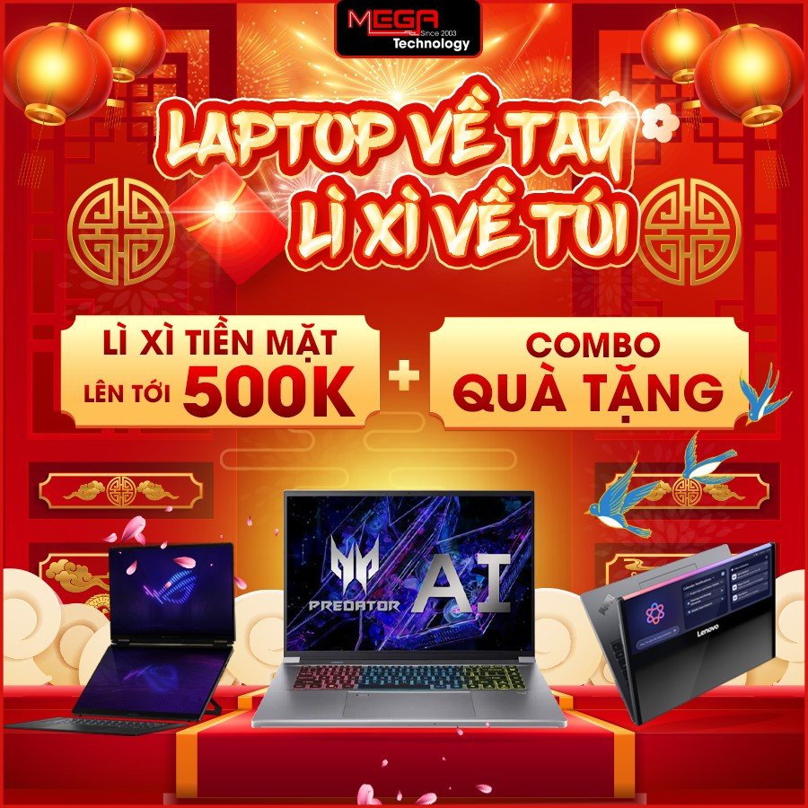 Trong suốt thời gian từ 09/02 đến 28/02/2026, khách hàng mua laptop chính hãng tại MEGA Technology sẽ được nhận lì xì tiền mặt lên đến 500.000 đồng, kèm theo combo quà tặng tiện ích như giá đỡ laptop, balo, chuột không dây và lót chuột MEGA độc quyền.