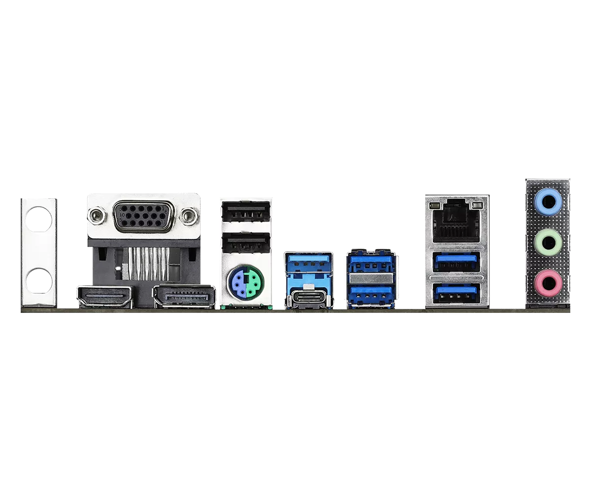 | Cổng I/O phía sau | - Giá đỡ ăng-ten - 1 cổng PS/2 cho chuột/bàn phím - 1 cổng D-Sub - 1 cổng HDMI - 1 cổng DisplayPort 1.4 - 1 cổng USB 3.2 Gen2 Type-A (10 Gb/s) (Hỗ trợ chống tĩnh điện) - 1 cổng USB 3.2 Gen2 Type-C (10 Gb/s) (Hỗ trợ chống tĩnh điện) - 4 cổng USB 3.2 Gen1 (hub ASMedia ASM1074) (Hỗ trợ chống tĩnh điện) - 2 cổng USB 2.0 (Hỗ trợ chống tĩnh điện) - 1 cổng LAN RJ-45 có đèn LED (đèn LED ACT/LINK và đèn LED SPEED) - Giắc cắm âm thanh HD: Line in / Loa trước / Micro |