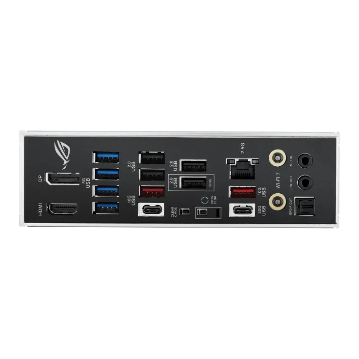 | Cổng I/O phía sau | 1 x USB4® (C), 1 x USB 10Gbps (C), 3 x USB 10Gbps (A), 1 x USB 5Gbps (A) 4 x USB 2.0, 1 x HDMI, 1 x DisplayPort, 1 x Wi-Fi Module 1 x Intel 2.5Gb LAN, 2 x Audio jacks, 1 x Optical S/PDIF Out 1 x BIOS FlashBack™ button, 1 x Clear CMOS button |
