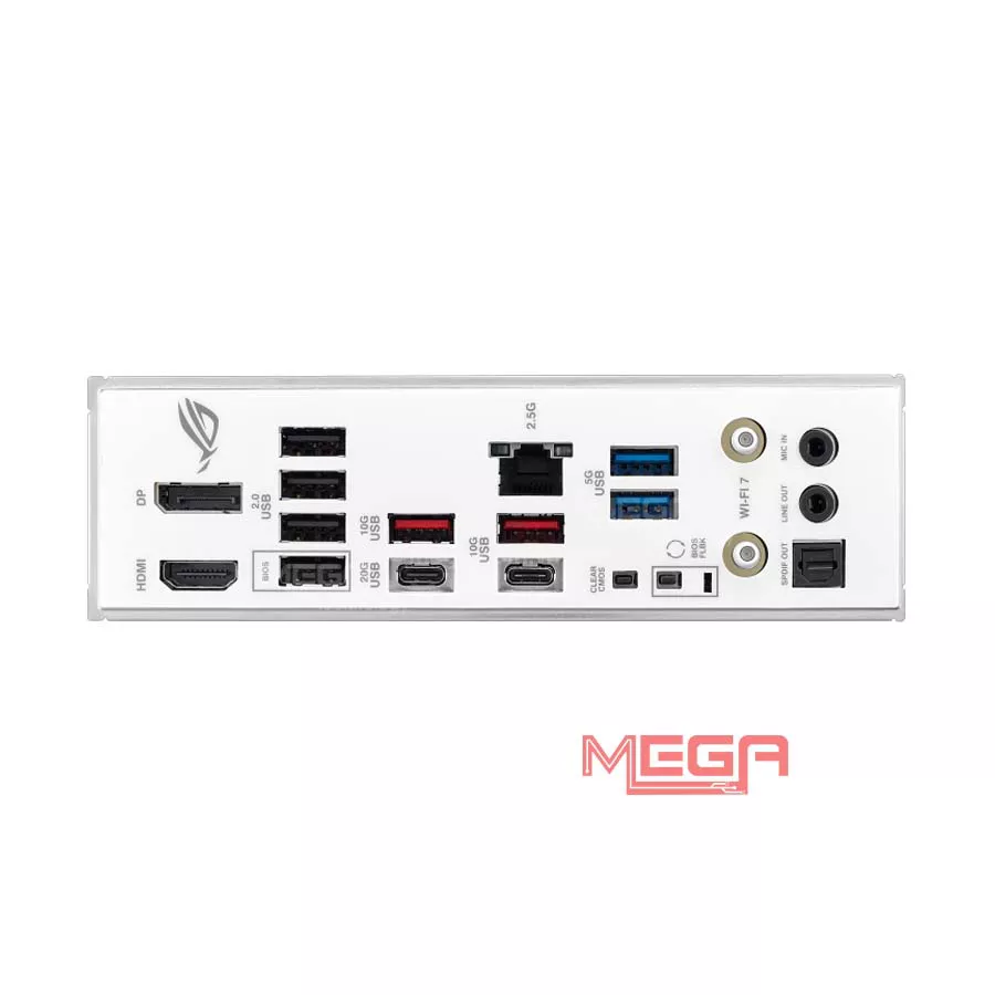 | Cổng I/O phía sau | 1 x Thunderbolt™ 4, 1 x USB 20Gbps (C), 1 x USB 10Gbps (A), 6 x USB 5Gbps (A), 1 x USB 2.0 1 x HDMI™, 1 x DisplayPort 1 x Wi-Fi Module (Wi-Fi 7), 1 x Intel® 2.5Gb Ethernet 2 x Audio jacks, 1 x Optical S/PDIF out, 1 x BIOS FlashBack™, 1 x Clear CMOS |