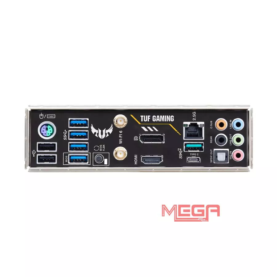| Cổng I/O phía sau | - 2 cổng USB 3.2 Gen 2 (1 cổng Type-A + 1 cổng USB Type- C® ) - 4 cổng USB 3.2 Gen 1 (4 cổng Type-A, một cổng có thể chuyển đổi thành USB BIOS FlashBack™) - 2 cổng USB 2.0 (2 cổng Type-A) - 1 cổng DisplayPort - 1 cổng HDMI® - 1 mô-đun Wi-Fi - 1 cổng Ethernet Realtek 2.5Gb - 5 giắc cắm âm thanh - 1 cổng xuất quang S/PDIF - 1 nút BIOS FlashBack™ - 1 cổng kết hợp PS/2 cho bàn phím/chuột |