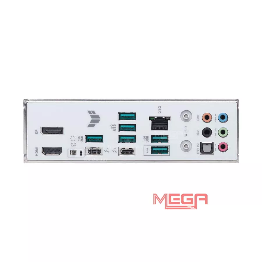 | Cổng I/O phía sau | 1 x Thunderbolt™ 4, 1 x USB 20Gbps (C), 3 x USB 10Gbps (A), 4 x USB 5Gbps (A) 1 x DisplayPort, 1 x HDMI™ 1 x Wi-Fi Module (Wi-Fi 7), 1 x Intel® 2.5Gb Ethernet 2 x Audio jacks, 1 x Optical S/PDIF out, 1 x BIOS FlashBack™ button |