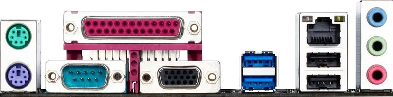 | Cổng I/O phía sau | 1 x PS/2 keyboard port, 1 x PS/2 mouse port 1 x D-Sub (VGA), 1 x Parallel port (LPT) 1 x Serial port (COM), 2 x USB 3.0/2.0, 4 x USB 2.0/1.1 1 x RJ-45 port, 3 x audio jacks |