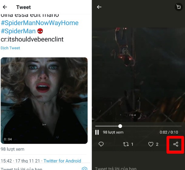 Bước 1: Bạn cần mở ứng dụng Twitter > nhấn chọn vào video Twitter bạn muốn tải về > Nhấn vào biểu tượng chia sẻ (Share) như hình dưới đây.