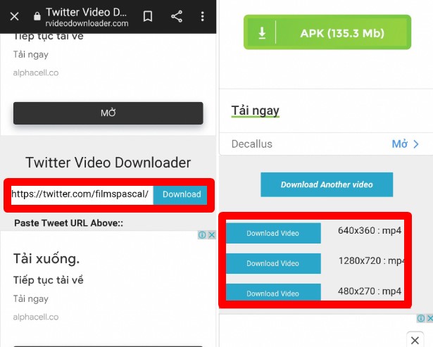 Bước 5: Dán đường link video Twitter và nhấn Download > Sau đó chọn chất lượng video mà bạn mong muốn, bao gồm các mức như 720p (HD), 360p, 270p ở định dạng MP4