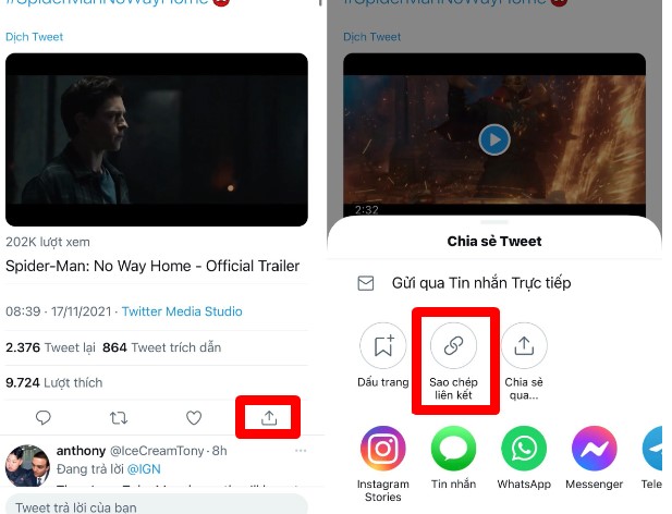 Bước 1: Ngay tại video Twitter mà bạn muốn download về điện thoại > bạn nhấn vào biểu tượng chia sẻ Tweet > xong nhấn Sao chép liên kết như hình dưới đây.