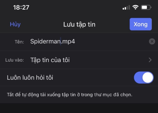 Bước 6: Tiếp tục đặt tên cho tập tin, chọn Lưu vào: Tập tin của tôi > Nhấn Xong. Sau khi hoàn thành xong các thao tác trên, bạn nhấn vào biểu tượng thư mục bên góc trái để quay lại Tập tin của tôi.