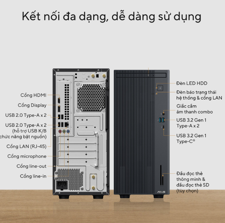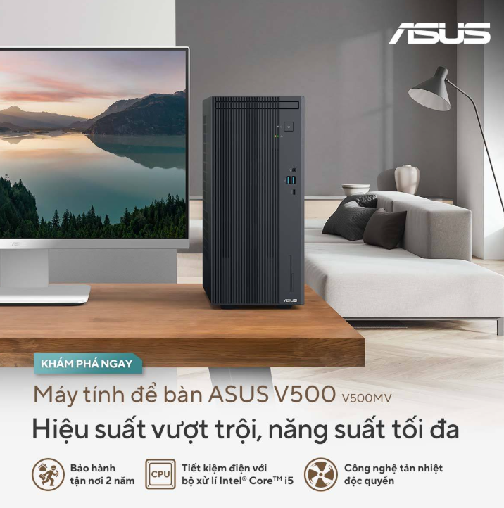 - ASUS V500MV: đại diện cho dòng máy tính để bàn dạng tháp hướng tới người dùng phổ thông nâng cao và văn phòng hiện đại. Máy tập trung vào hiệu năng ổn định cho đa nhiệm hàng ngày, thiết kế gọn gàng dễ bố trí và khả năng nâng cấp linh hoạt theo thời gian, đi cùng với chế độ bảo hành tận nơi 2 năm. Đây là lựa chọn phù hợp cho người dùng cần một hệ thống cố định, bền bỉ, dễ mở rộng nhưng không muốn đi theo hướng workstation hay gaming quá chuyên biệt.